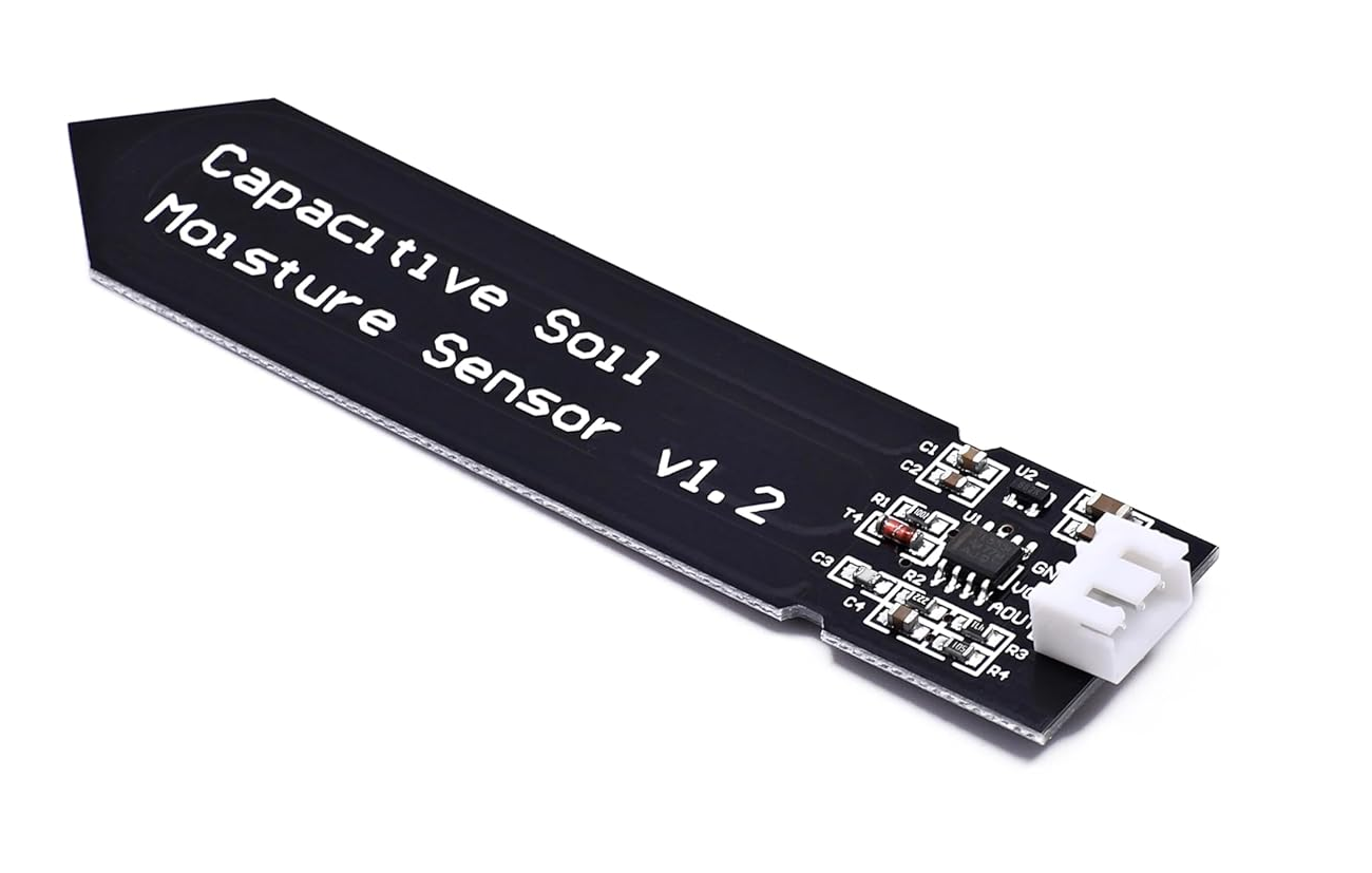 적옥토를 화분에 담고 저울에 올려놓은 뒤 물을 화분에 주면서 물의 양을 기록하고, 센서의 습도 값을 읽어보았습니다. 센서는 아마존에서 판매하는 아래의 제품을 사용하였습니다. 이 제품은 용량(capacitace)형 센서로 센서 주위의 흙의 수분함량에 따라서 유전율(dielectric property)이 달라짐을 이용하여 측정하는 방식입니다.