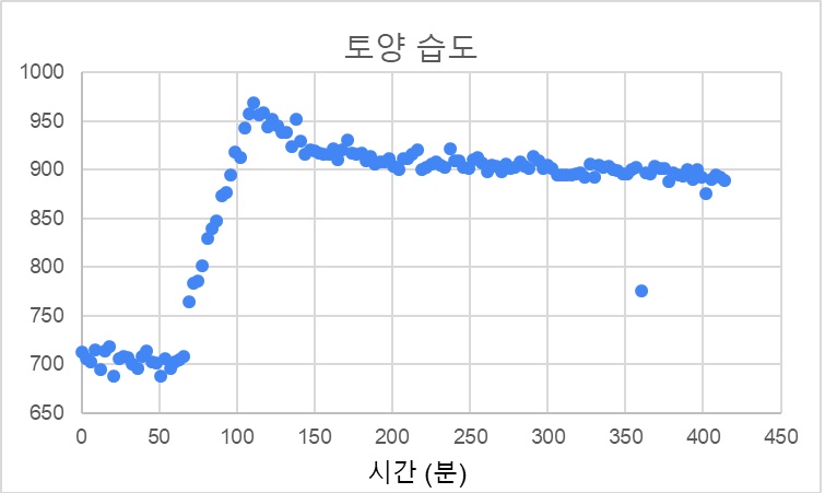 물을 준 시점은 약 50분 정도이고, 이후 약 110분까지 센서의 값이 계속 증가하는 것을 볼 수 있습니다. 아마도 흙에 들어간 물이 흙입자들을 젖게 만들면서 물이 퍼지는데 시간이 걸리는 것 같습니다. 그 이후에는 수분의 증발로 센서 값이 천천히 줄어드는 것을 볼 수 있습니다. 따라서 센서의 값이 안정해 질때까지 약 60분 정도 걸리는 것을 알 수 있습니다.